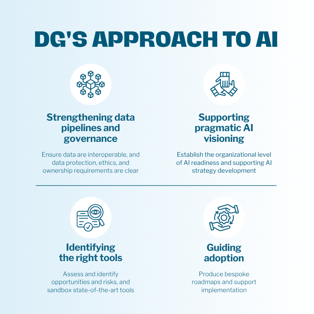 As we celebrate 25 years of DG’s efforts supporting institutions to use digital and data to accelerate and amplify their impact, governments, companies, organizations, and people globally are grappling with how to invest in AI tools with this same goal in mind. Technology is evolving rapidly, the hype cycle is overwhelming, and many implementations are falling short of their intended value.