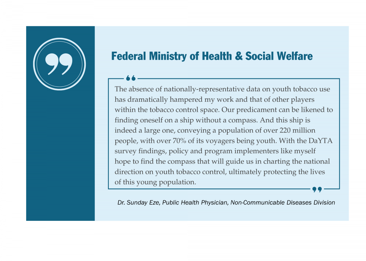For DaYTA Phase 1 countries (Kenya, DRC, and Nigeria), we envision our data and survey findings being actively used to improve national enforcement efforts that deter youth initiation and ultimately prevent tobacco-related illness and death. Although all countries prohibit the sale of tobacco to minors, adolescents continue to access these products with ease. While specific enforcement barriers vary by context – from retailer non-compliance and informal markets to gaps in community-level monitoring and limited cessation support for young people – these differences underscore the value of DaYTA’s comparable, cross-country evidence that sheds light on country-specific implementation gaps. Our stakeholders have also emphasized the need for cessation programs designed specifically for young people, reinforcing the demand for coordinated, evidence-based interventions.