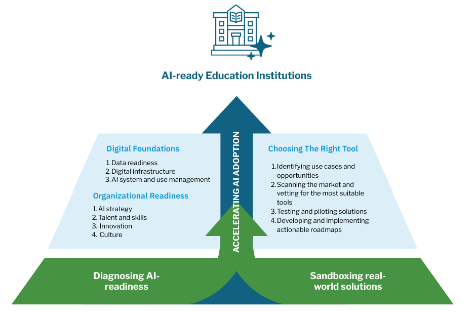 - Second, a bespoke AI sandboxing process supports universities and schools to identify use cases, scan the global AI market, prototype shortlisted tools (or scope the development of new tools where gaps exist) that fit with the local context in safe staging environments using synthetic datasets, and develop actionable roadmaps to implementation.